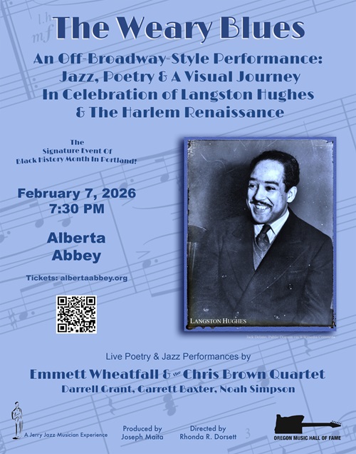 In honor of Black History Month and the 100th anniversary of the publication of Langston Hughes’ first collection of poetry, The Weary Blues, Jerry Jazz Musician Experiences is staging a multi-media off-Broadway-style production headlined by prominent Portland entertainers that will include jazz music, performance poetry, and historic visual imagery. The event will be held on February 7, 2026 at 7:30 p.m. in the NE Portland, Oregon venue The Alberta Abbey, and is presented in partnership with the Oregon Music Hall of Fame.